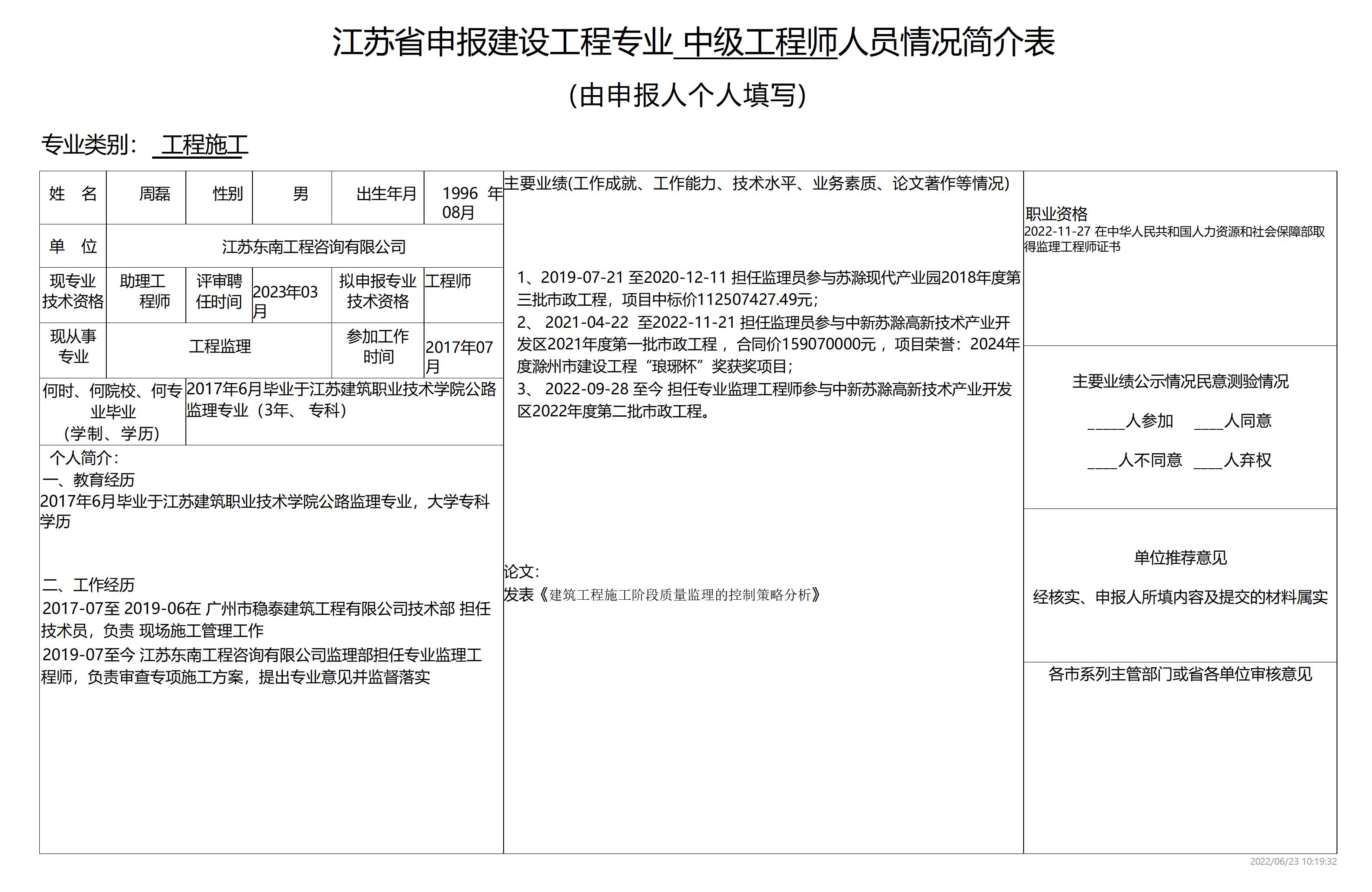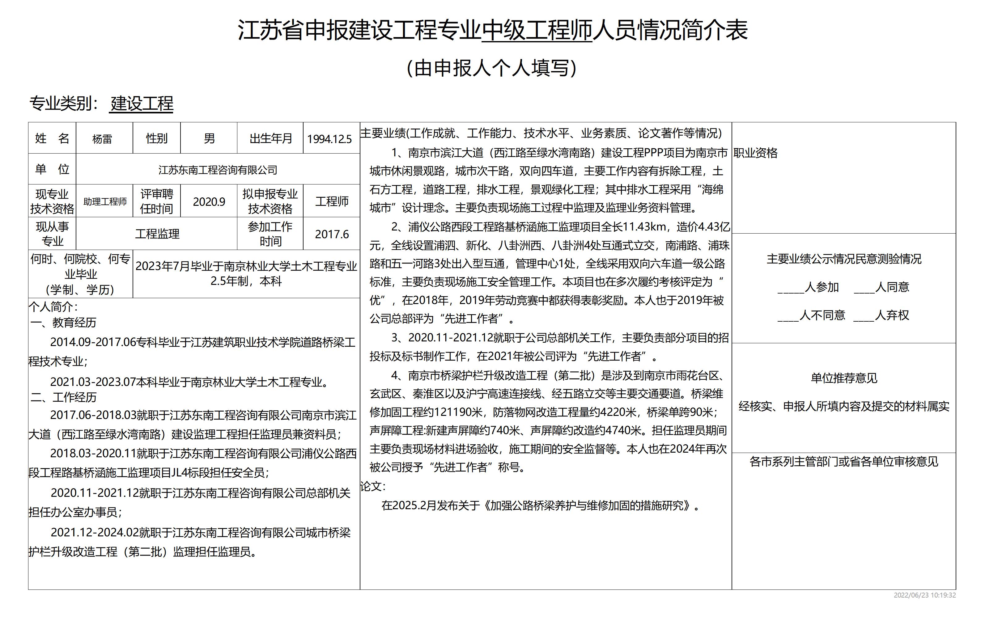 根據《江蘇省建設工程專業技術資格條件(試行)》規定,2025年度有楊雷等5名同志擬申報江蘇省住房和城鄉建設廳建設工程專業級工程師。為體現公開、公平、公正原則,廣泛聽取群眾意見,現將擬申報人員信息予以公示。